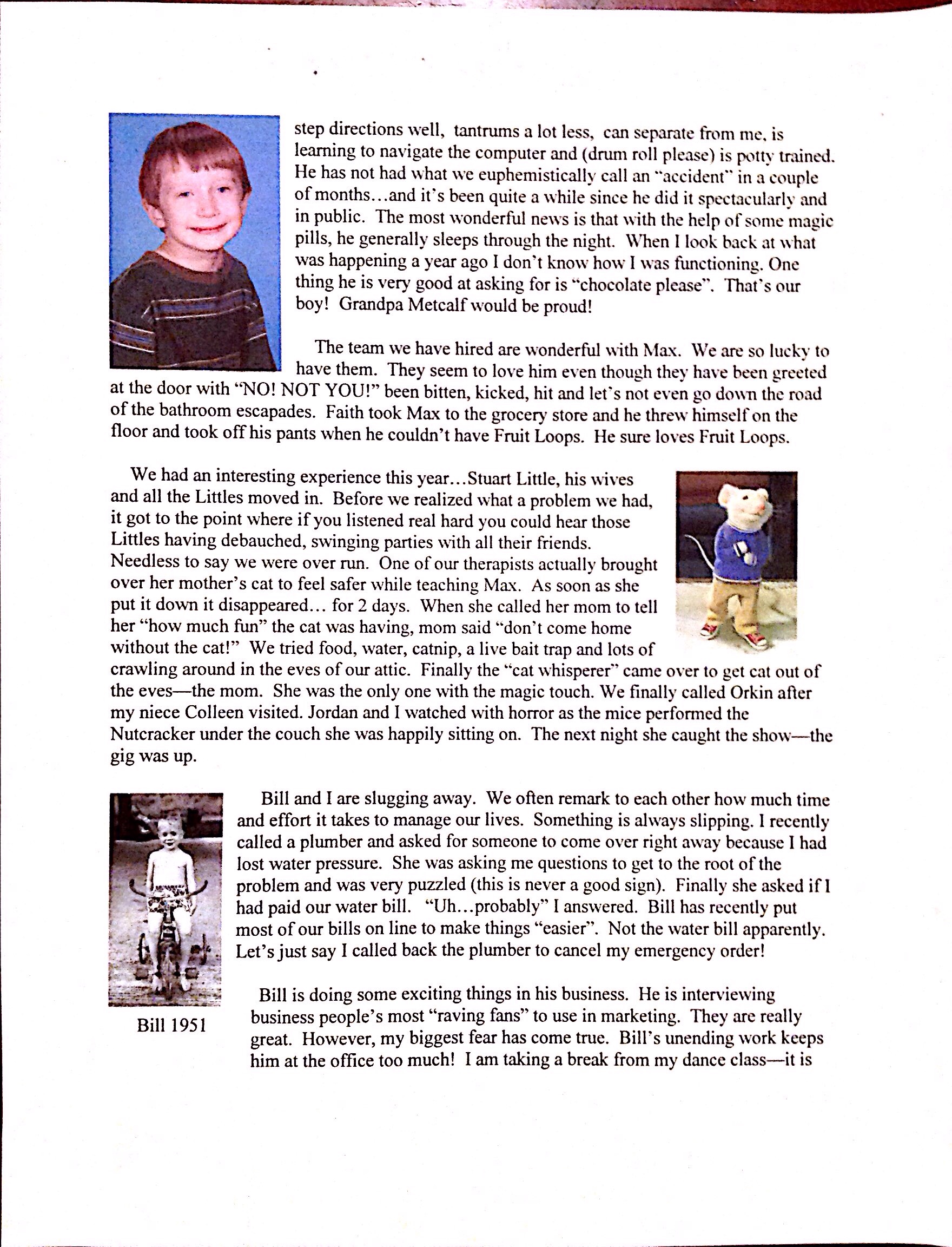 For a good 10 years I was Max’s person. I took care of most of the duties an autistic child requires. Bill contributed with the things he is really good at like research, getting funding and firing people. He was not in the “inner circle” -who was? Me and Max. Of course Bill would take the kids someplace so I could get a nap-but I was “numeral uno”-the “big dog” as my dad likes to say (about himself of course).